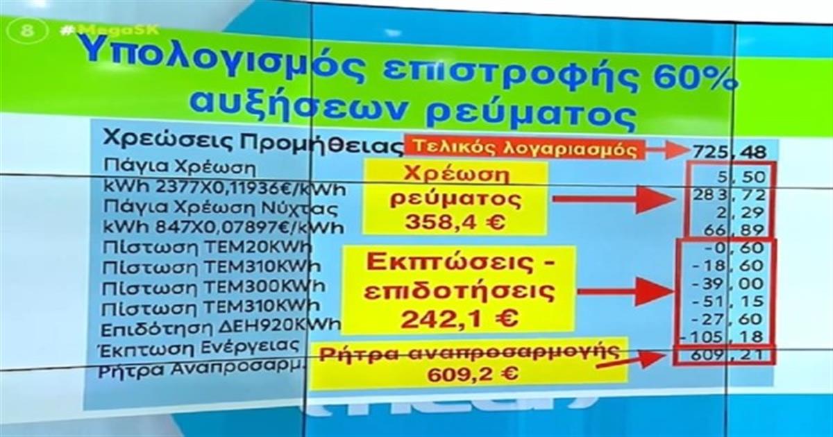 (γ) Kατά τον μήνα Ιούνιο θα επιστραφεί στους λογαριασμούς IBAN των νοικοκυριών το 60% της αύξησης για όλους τους λογαριασμούς ρεύματος που εκδόθηκαν από τον Δεκέμβριο του 2021 έως και τον Μάιο του 2022 και αφορούν την κύρια κατοικία. Η επιστροφή μπορεί να φτάσει έως και τα 600 ευρώ ανά ωφελούμενο. Το κόστος υπολογίζεται σε 280 εκατ. ευρώ.