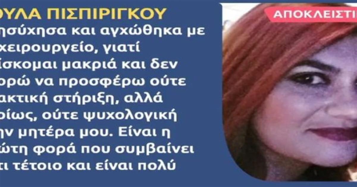 Αυτά χαρακτηριστικά φέρεται σύμφωνα με το κοντινό της περιβάλλον να ανέφερε: «Ανησύχησα και αγxώθηκα με το χειρουργείο, γιατί βρίσκομαι μακριά και δεν μπορώ να προσφέρv ούτε πρακτική στήριξη αλλά κυρίως ούτε ψυχολογική στην μητέρα μου. Είναι η πρώτη φορά που συμβαίνει κάτι τέτοιο και είναι πολύ δύσκολο να το διαχεiριστεί κάποιος που βρίσκεται όχι μόνο μακριά αλλά και σε αυτή την κατάσταση».