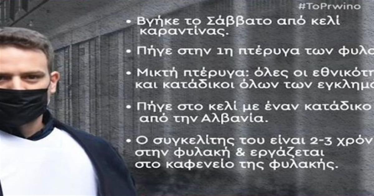 «Είναι ψύχραιμος, ήρεμος, πιο σιωπηλός. Παρακολουθεί το νέο περιβάλλον, τους ανθρώπους. Διαβάζει, έχει μαζί του κούτες με παραπάνω από 50 βιβλία. Μιλάει σε καρτοτηλέφωνο με την οικογένειά του. Προαυλίζεται και γuμνάζεται στο υπαίθριο γuμναστήριο» αποκάλυψε η Κέλλυ Χενοπώρου στην εκπομπή του ΑΝΤ1.