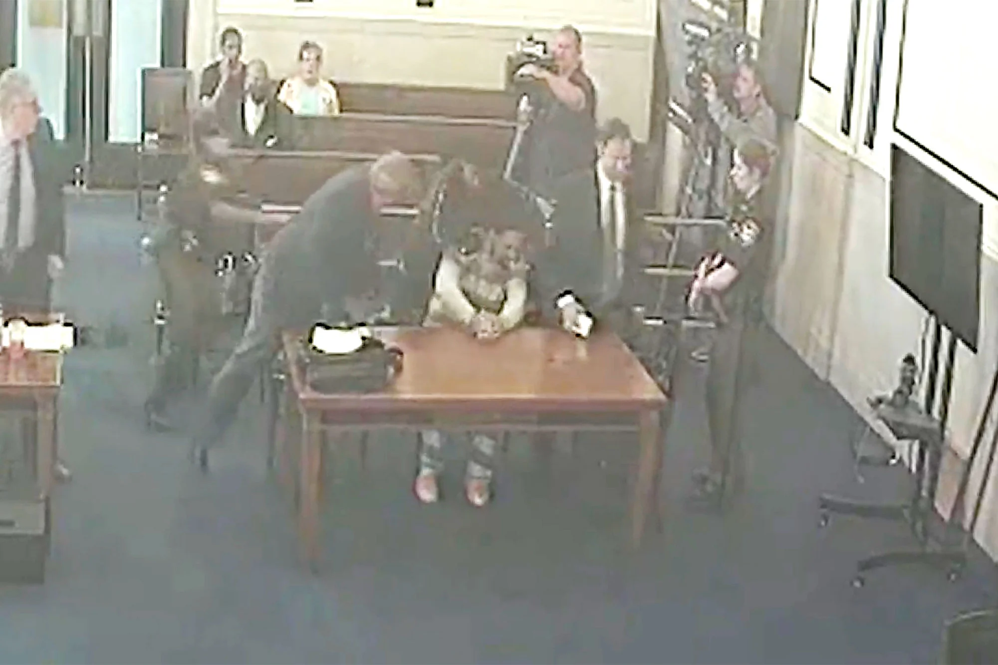 Την ώρα που κανείς δεν το περίμενε, όταν σηκώθηκαν οι δικηγόροι για να αποχωρήσουν από την αίθουσα, ο Antonio Hughes τρέχει γρήγορα μπροστά στο έδρανο του κατηγορούμενου και γρονθοκοπεί με μανία στο κεφάλι και στο σώμα τον Desean Brown. Μετά βίας οι αστυνομικοί που σπεύδουν, τον συγκρατούν.