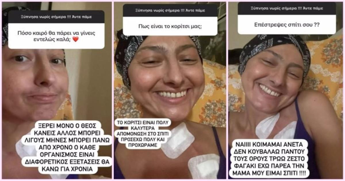 Σχετικά με το πώς είναι και αν επέστρεψε σπίτι, απάντησε: «Το κορίτσι είναι πολύ καλύτερα, απομόνωση στο σπίτι. Προσέχω πολύ και προχωράμε! Ναι, είμαι σπίτι, κοιμάμαι άνετα δεν κουβαλάω παντού τους ορούς, τρώω ζεστό φαγάκι, έχω παρέα τη μαμά μου».