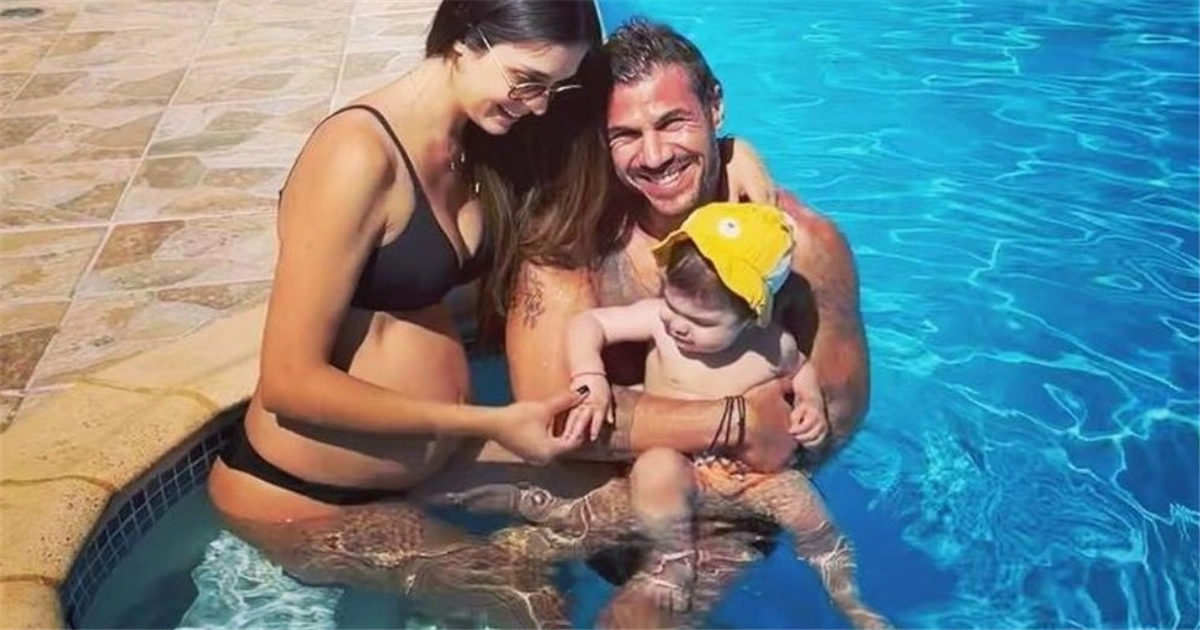 Στη μία από αυτές ο ίδιος ποζάρει στην πισίνα με τον μικρό Αχιλλέα και την έγκυο σύζυγό του, η οποία γεννάει σε λίγες μέρες.