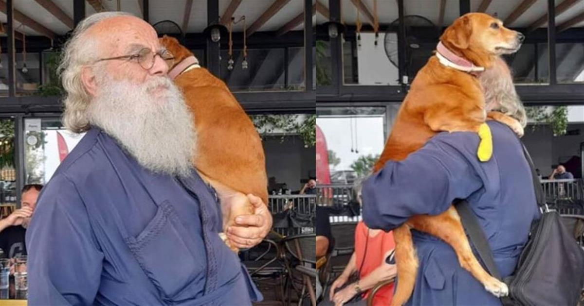 Λέσβος: Ιερέας κουβαλάει στα χέρια μια σκυλίτσα που έχει πρόβλημα με τη μέση της