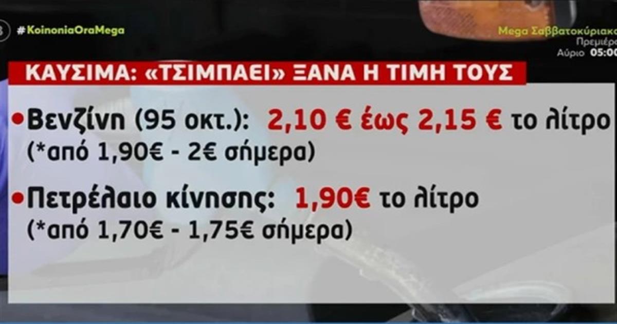 Σύμφωνα με το ρεπορτάζ του Mega η βενζίνη των 95 οκτανίων, που τις τελευταίες μέρες είχε πέσει κάτω από τα 2 ευρώ, θα φτάσει τα 2,10-2,15 ευρώ το λίτρο, ενώ το πετρέλαιο κίνησης από 1,70-1,75 θα αγγίξει τα 1,90 ευρώ το βαρέλι.
