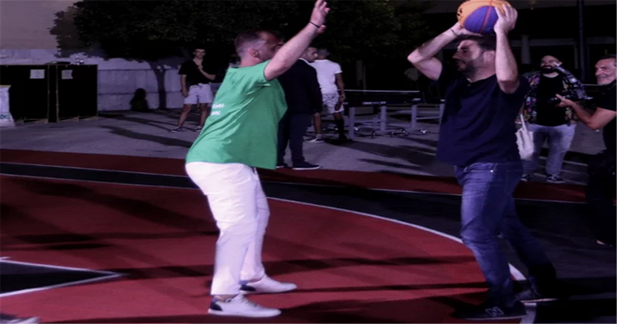 Ο Νίκος Ανδρουλάκης έπαιξε και μπάσκετ στις εκδηλώσεις του ΠΑΣΟΚ στο Ζάππειο -Αριστερά με τα λευκά ο στενός του συνεργάτες Βαγγέλης Τσόγκας -Φωτογραφία: ΧΡΗΣΤΟΣ ΜΠΟΝΗΣ/Eurokinissi